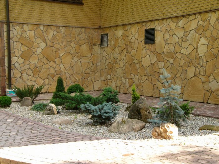 Оформленные этим минералом участки приобретают теплый и уютный вид. Материал гармонично вписывается в ландшафт, подчеркивает достоинства территории.
